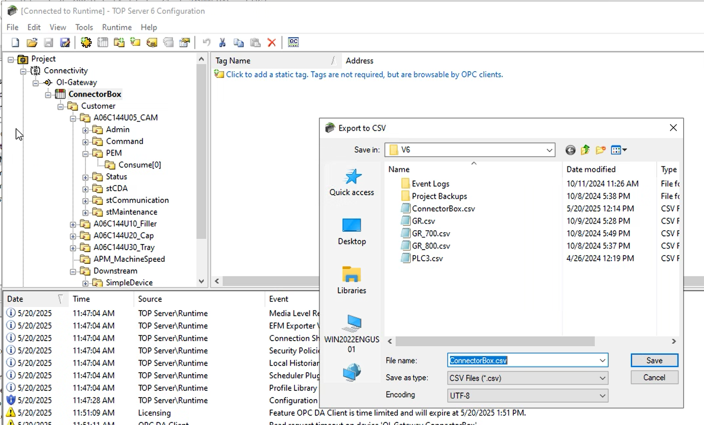 My OEM customer currently uses TOP Server 6 instead of AVEVA OPC UA Server for different reasons. One of them is that it's possible in TOP Server 6 to export / import tag configuration (structure).
