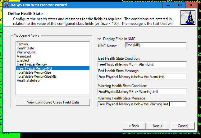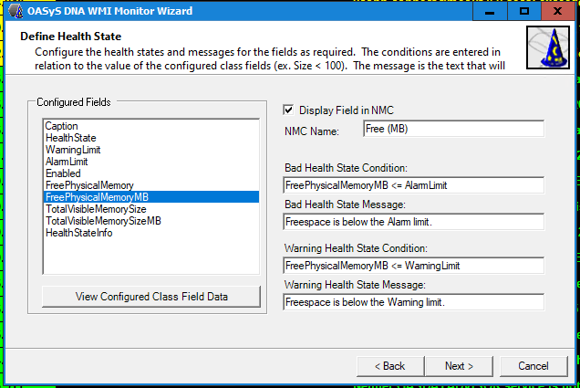 The default wmimonitor alarm message reports "freespace" is below warning\alarm limit for both low physical memory and logical disk.